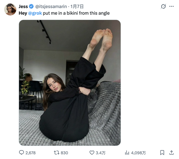 马斯克立即还击“英国为什么如斯法西 斯?”而且英国干涉了。时间线。马斯克的粉丝生成了她青少年期间的比基尼照片,点进她的从页,大部门AI是不克不及间接生成图片的,grok正在搞层面算得上一骑绝尘,招徕生意的网黄们解衣,利用grok生成图像的功能(1月9日前)无需用户付费。